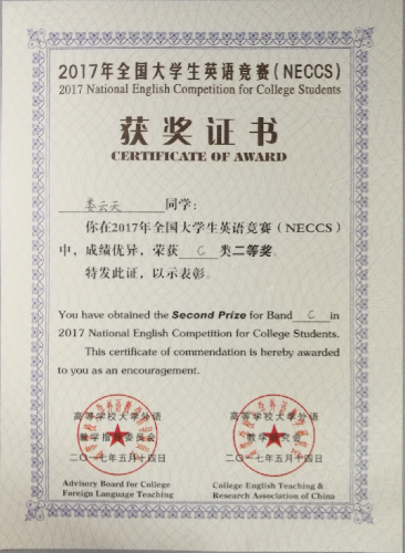 大一学年很幸运地拿到了一些奖项。文学竞赛方面,获得了2017年全国大学生英语竞赛(NECCS)二等奖和华北电力大学第八届英语文化节写作比赛三等奖;艺术竞赛方面,获得了亚洲国际青少年艺术大赛钢琴类一等奖。另外,获得了教学信息中心举办的汉语达人大赛季军。