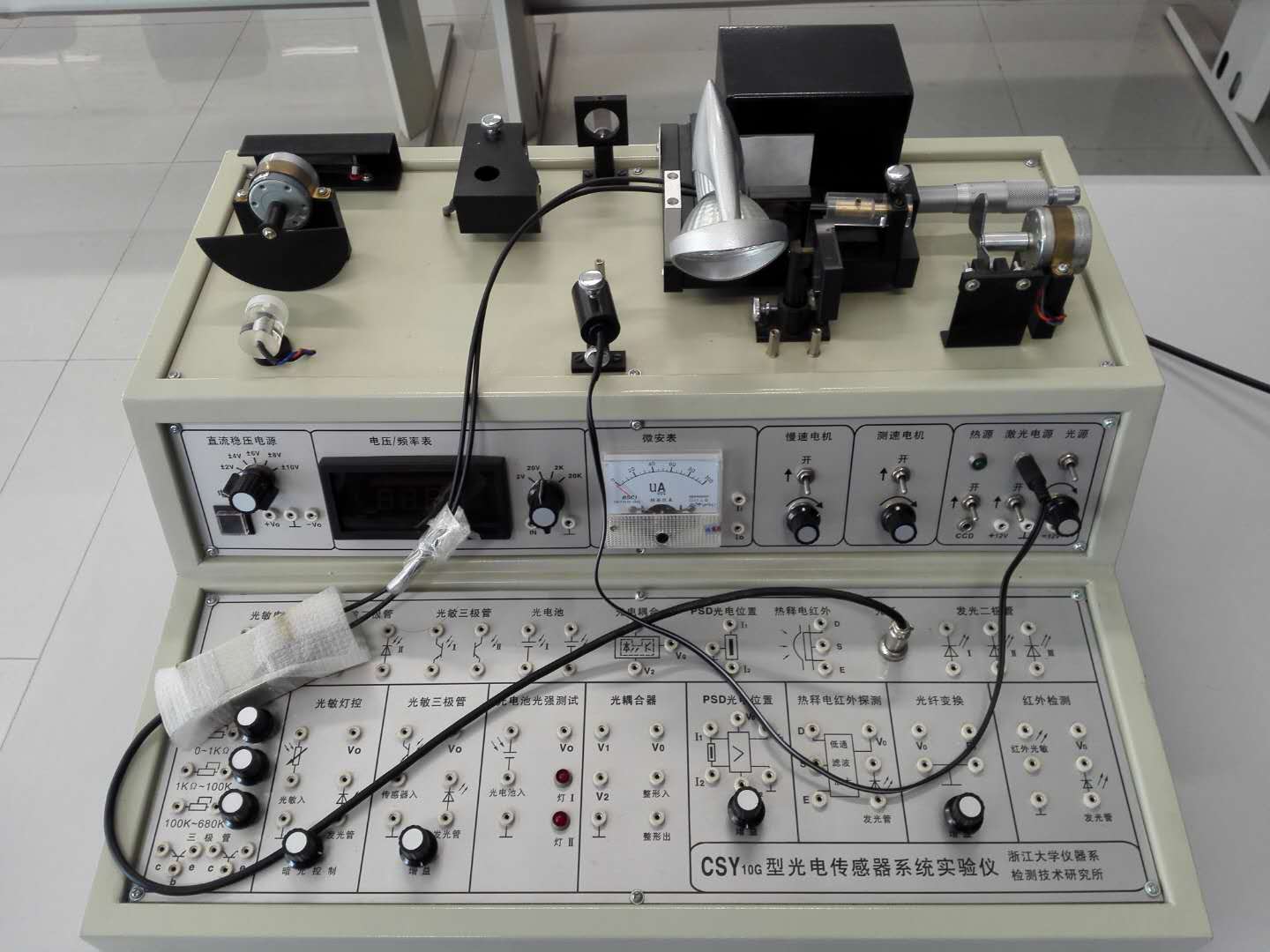 传感器实验室有CSY10A型传感器系统实验仪和CSY10G型光电传感器系统实验仪。CSY10A型传感器系统实验仪集被测体、各种传感器、信号激励源、处理电路和显示器于一体,可以组成一个完整的测试系统,能完成包含光、磁、电、温度、位移、振动、转速等内容的测试实验。CSY10G型光电传感器系统实验仪可将各种光电(光敏)传感器、被测体、信号源、仪表显示、信号采集、处理电路及实验所需的温度、位移、光源、旋转装置集中于一机,对十种光电传感器进行光电特性、光照特性、温度特性等二十余种实验。承担的实验课程包括本科生《传感器原理及应用》课程和研究生《检测新技术》课程。