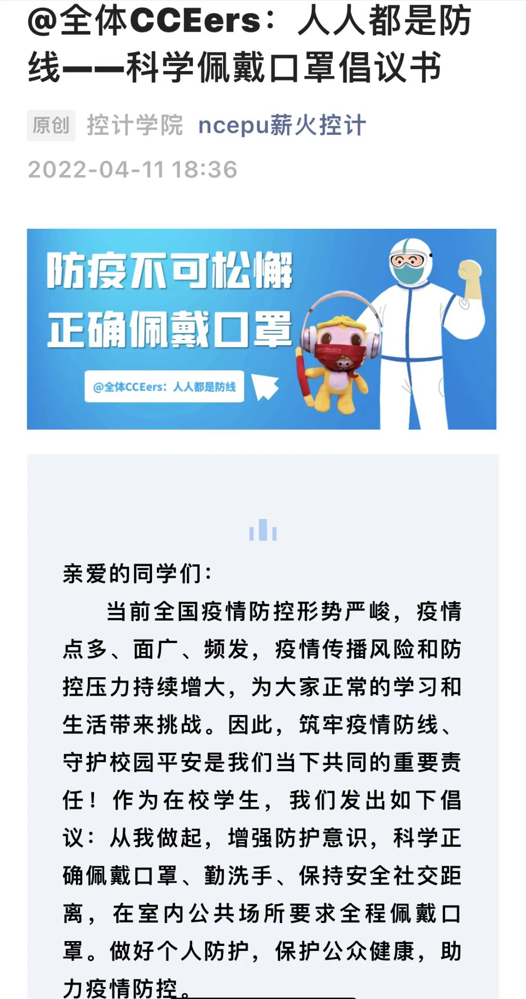 疫情防控,毫不松懈。为更好地配合学校开展防疫工作,进一步增强学生防疫意识,近日,学院团委发布科学佩戴口罩倡议书,各党支部接力承诺;学院发放“控计专属”口罩,成为校园里一道靓丽风景线。
