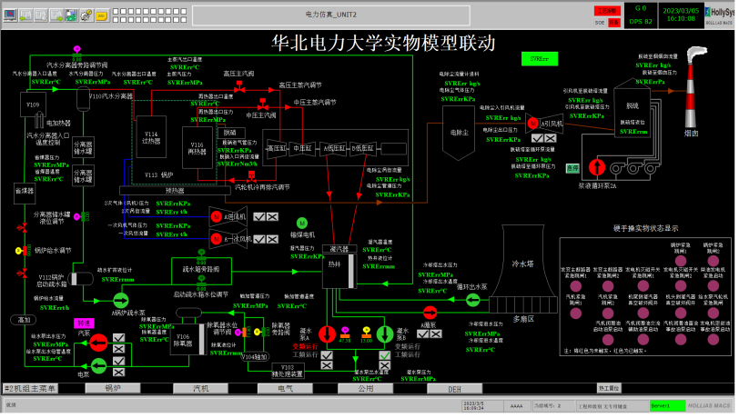 该实验平台由DCS控制系统及实物模型组成,模拟了1000MW超超临界火电机组发电的全部流程,包括燃煤输送、锅炉、汽机、励磁发电、脱销、除尘、脱硫以及化学水处理等子系统,实物模型上装有测量仪表以及执行机构。该平台通过DCS控制系统实现对实物模型的控制联动,可将实际发电指令下达各类仪表中展示真实结果,从而实现对实际发电过程的全景再现。